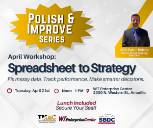 Excel Bootcamp takes place on April 21, 2026, from 12:00 to 1:00 p.m. at the WT Enterprise Center, 2300 N. Western St. in Amarillo.
