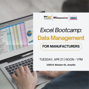 Excel Bootcamp takes place on April 21, 2026, from 12:00 to 1:00 p.m. at the WT Enterprise Center, 2300 N. Western St. in Amarillo.